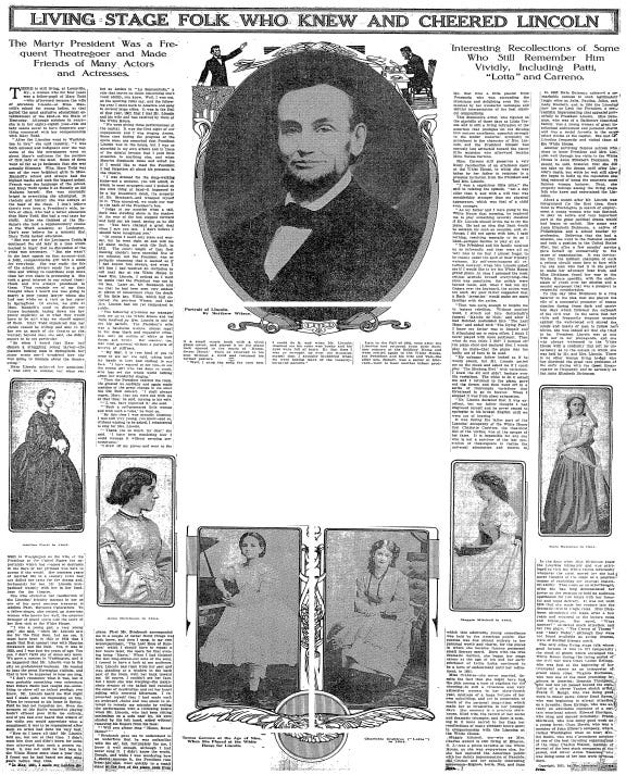 LIVING STAGE FOLK WHO KNEW AND CHEERED LINCOLN: The Martyr President Was a Frequent Theatregoer and Made Friends of Many Actors and Actresses; Interesting Recollections of Some Who Still Remember Him Vividly, Including Patti, "Lotta" and Carreno. (PDF)