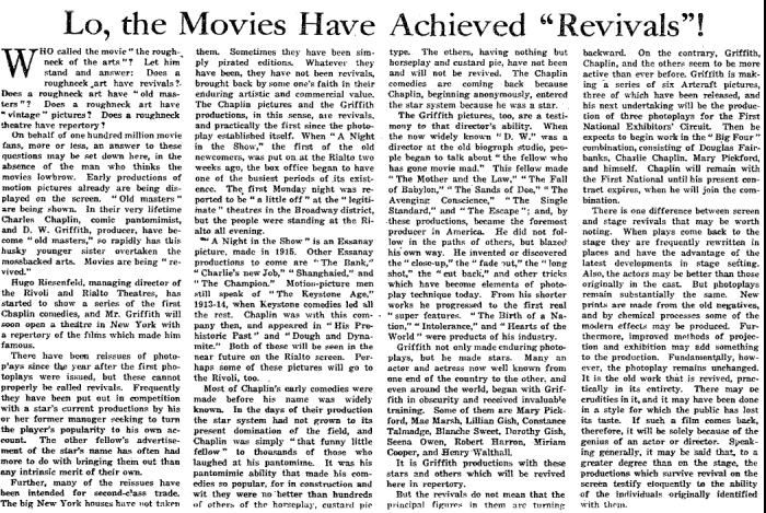 Hugo Riesenfeld, managing director of the Rivoli and Rialto Theatres, has started to show a series of the first Chaplin comedies, and Mr. Griffith [D.W. Griffith who most famously directed 1915's The Birth of a Nation] will soon open a theatre in New York with a repertory of the films which made him famous.