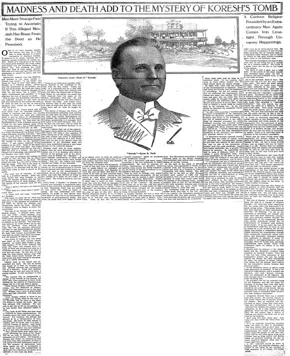 MADNESS AND DEATH ADD TO THE MYSTERY OF KORESH'S TOMB: Men Meet Strange Fate Trying to Ascertain If This Alleged Messiah Has Risen From the Dead as He Promised. (PDF)