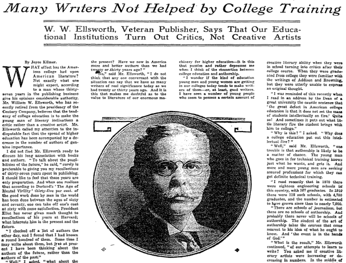 Many Writers Not Helped by College Training: W.W. Ellsworth, Veteran Publisher, Says That Our Educational Institutions Turn Out Critics, Not Creative Artists
