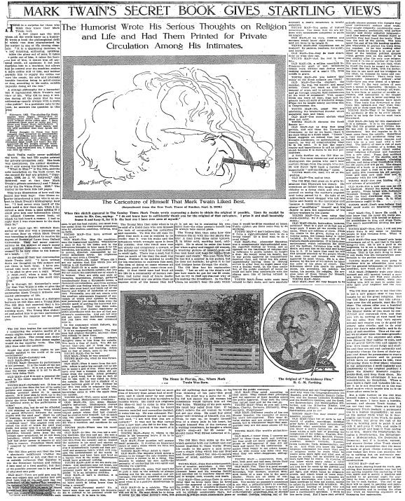 This issue of the Times came out about 10 days after Mark Twain died. The article excerpts a book called What is Man? that Twain had written and only shared with his close friends. Just 250 copies were printed, and were attributed to his personal secretary. Even his most knowledgeable biographer had never heard of it.