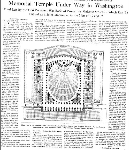 Memorial Temple Under Way in Washington: Fund Left by the First President Was Basis of Project for Majestic Structure Which Can Be Utilized as a Joint Monument to the Men of '17 and '76 Memorial Temple Under Way in Washington
