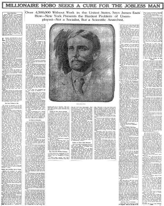 MILLIONAIRE HOBO SEEKS A CURE FOR THE JOBLESS MAN: Over 4,500,000 Without Work in the United States, Says James Eads How -- New York Presents the Hardest Problem of Unemployed -- Not a Socialist, But a Scientific Anarchist. (PDF)