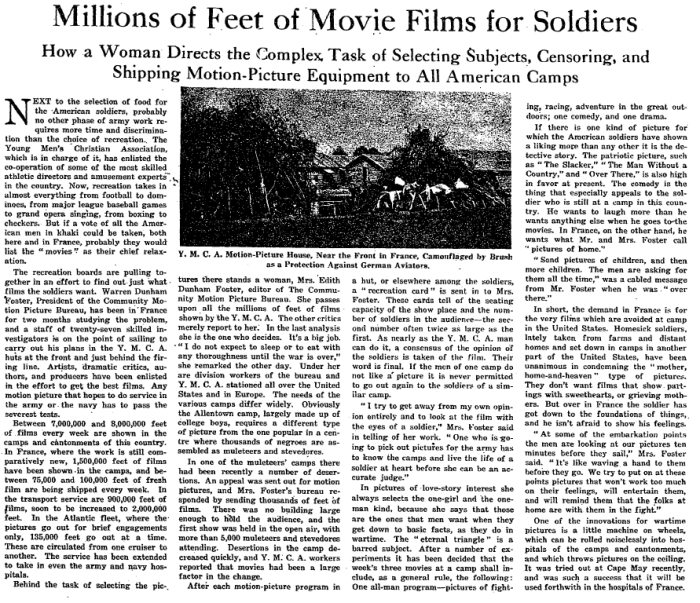 Millions of Feet of Movie Films for Soldiers: How a Woman Directs the Complex Task of Selecting Subjects, Censoring, and Shipping Motion-Picture Equipment to All American Camps