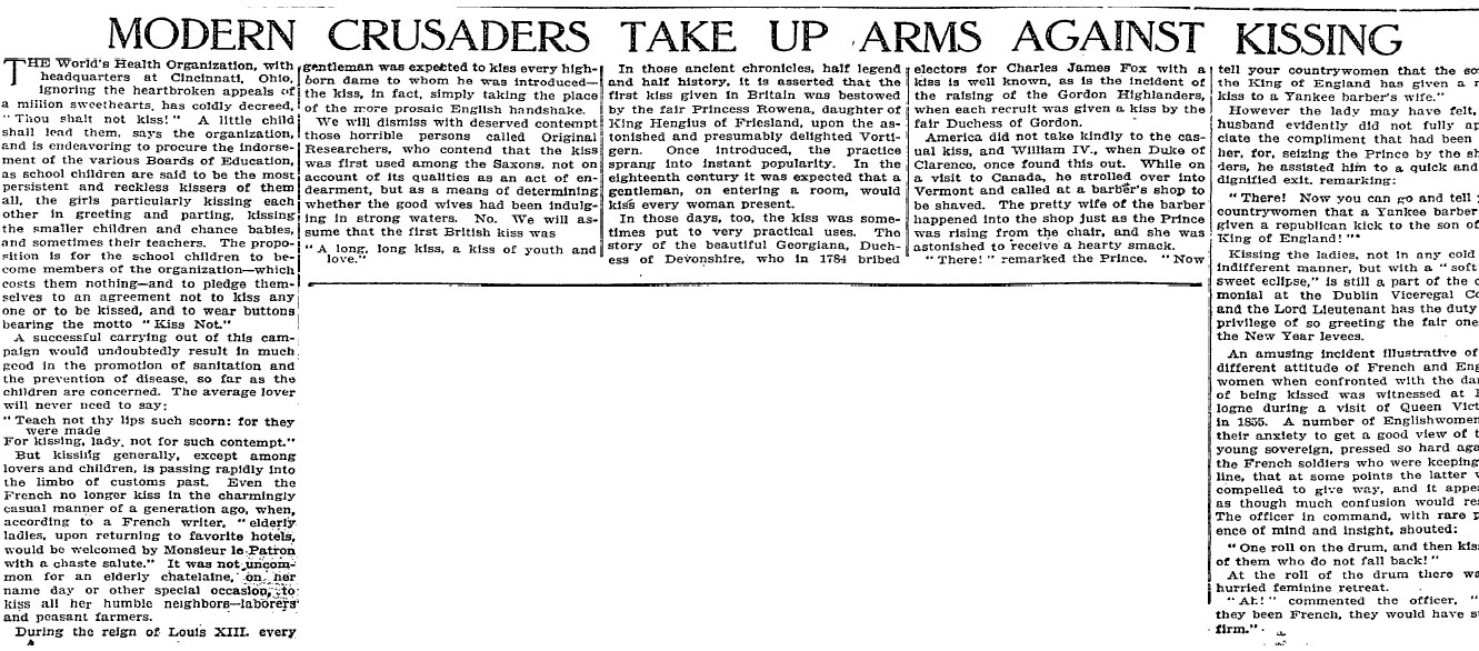A woman in Connecticut started a group called the World's Health Organization (not to be confused with the later UN organization with a similar name) and got a lot of publicity for her "Kiss Not" campaign: