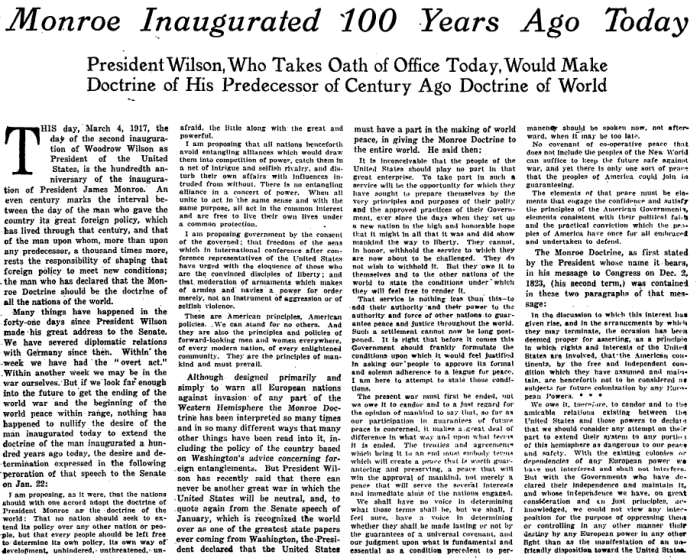 President James Monroe was inaugurated in 1817, with a presidency defined by the so-called Monroe Doctrine. 1917's President Woodrow Wilson advocated much the same policy, referring to Monroe in a speech to the Senate: