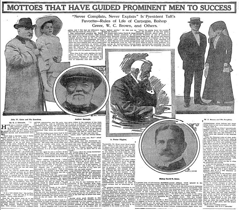 MOTTOES THAT HAVE GUIDED PROMINENT MEN TO SUCCESS: "Never Complain, Never Explain" Is President Taft's Favorite -- Rules of Life of Carnegie, Bishop Greer, W. C. Brown, and Others (PDF)
