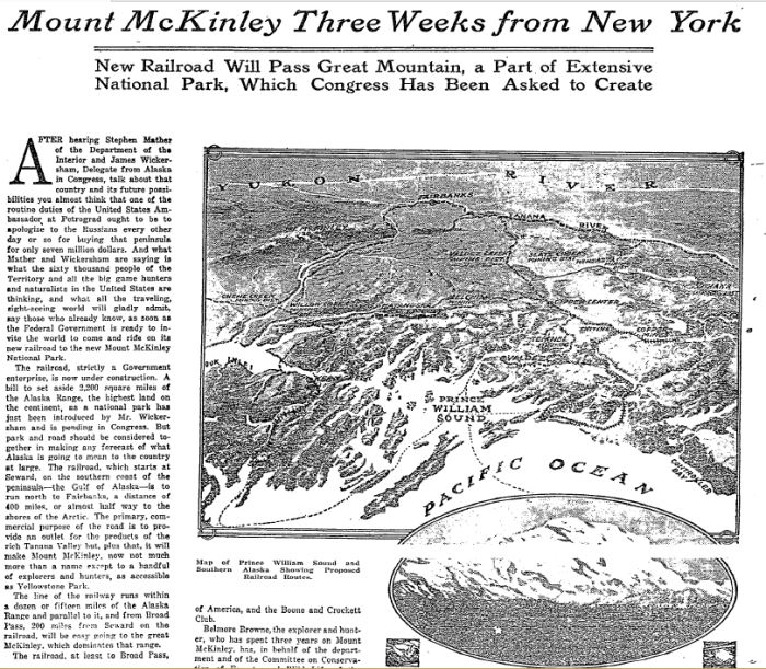 Mount McKinley Three Weeks from New York: New Railroad Will Pass Great Mountain, a Part of Extensive National Park, Which Congress Has Been Asked to Create