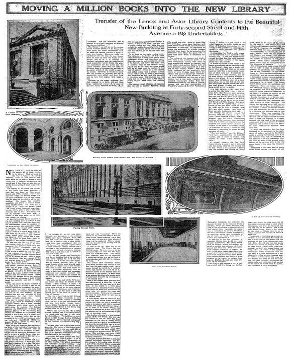 MOVING A MILLION BOOKS INTO THE NEW LIBRARY: Transfer of the Lenox and Astor Library Contents to the Beautiful New Building at Forty-second Street and Fifth Avenue a Big Undertaking. (PDF)