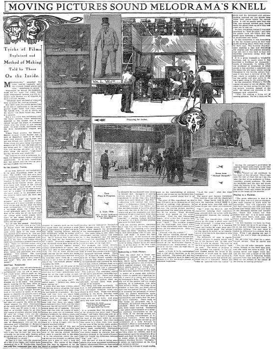 Movies were still relatively new technology in 1910, but filmmakers were already figuring out how to do special effects. This article exposes some of the secrets of "film tricks," but also talks about how the profession of acting was changing as a result of this new technology. For centuries, acting meant being on stage before a live audience. But not anymore. It reminds me of what publishers are going through now, as eReaders and digital newspapers threaten to make printed paper obsolete. New technology requires new skills, and new ways of thinking. Some actors saw film as an opportunity, while others saw it as the end of their careers.