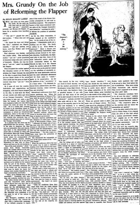 In a general way the plans can be pigeonholed into two groups. There is the plan to chaperon [sic] the flappers on automobile rides and dances. And there is the diametrically opposed plan to develop in them self-government. Since the Young Things have got out into the great wicked world, argue the propagandists of the latter school, parents should put the responsibility up to the girls themselves to take care of themselves and keep up the old standards.