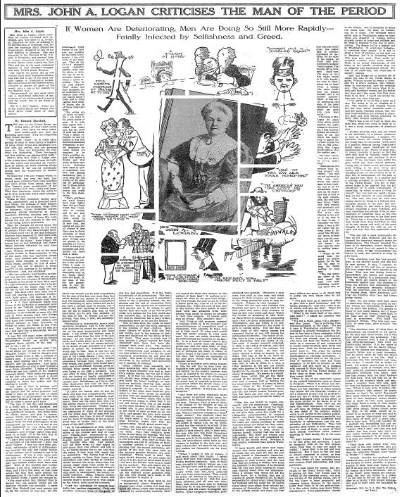 MRS. JOHN A. LOGAN CRITICISES THE MAN OF THE PERIOD: If Women Are Deteriorating, Men Are Doing So Still More Rapidly -- Fatally Infected by Selfishness and Greed. (PDF)