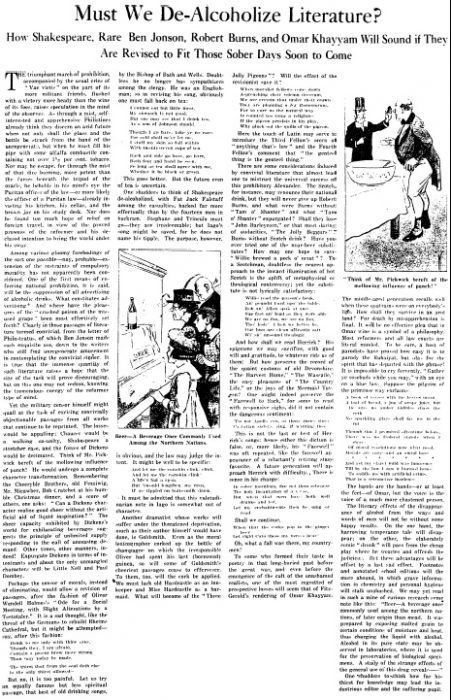 Two months after the 18th Amendment established prohibition, this satire wondered how far the movement would go. Would Dickens and Shakespeare's references to alcohol be expunged?