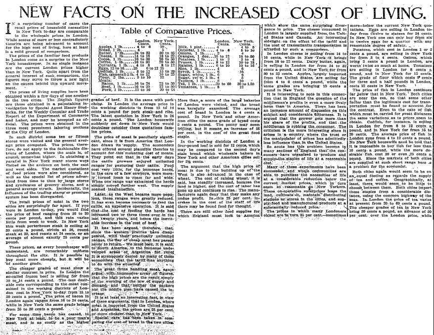 I think it's interesting to see how much things cost 100 years ago compared to today. In this case, the article compares the costs of foodstuffs in New York with London, so we get yet another data point. For example, a pound of apples cost between 4 and 6 cents in London 100 years ago, but it cost a whopping 10 cents in New York.