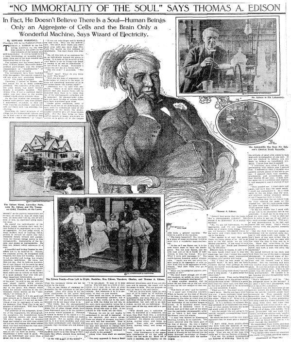 "NO IMMORTALITY OF THE SOUL" SAYS THOMAS A. EDISON: In Fact, He Doesn't Believe There Is a Soul -- Human Beings Only an Aggregate of Cells and the Brain Only a Wonderful Machine, Says Wizard of Electricity. (PDF)