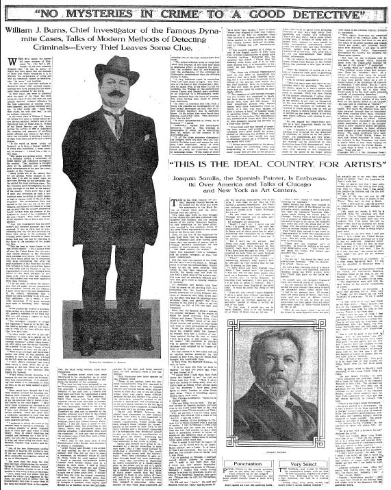"NO MYSTERIES IN CRIME TO A GOOD DETECTIVE" William J. Burns, Chief Investigator fo the Famous Dynamite Cases, Talks of Modern Methods of Detecting Criminals -- Every Thief Leaves Some Clue. (PDF)