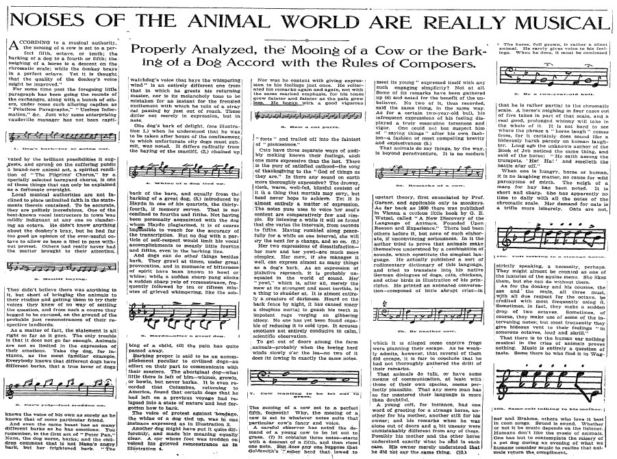 But did you know, according to no cited source other than "a musical authority," that "the mooing of a cow is set to a perfect fifth, octave or tenth; the barking of a dog to a fourth or fifth; the neighing of a horse is a descent on the chromatic scale; while the donkey brays in a perfect octave?"