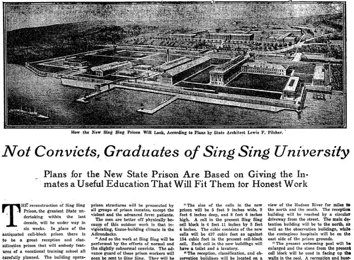 "It is my hope, entirely outside of the work of this commission," said Mr. Hubbell [Charles Bulkley Hubbell, Chairman of the Commission on New Prisons of the State of New York], "that the time is not far distant when prison extension work will be just as formally recognized as university extension work."