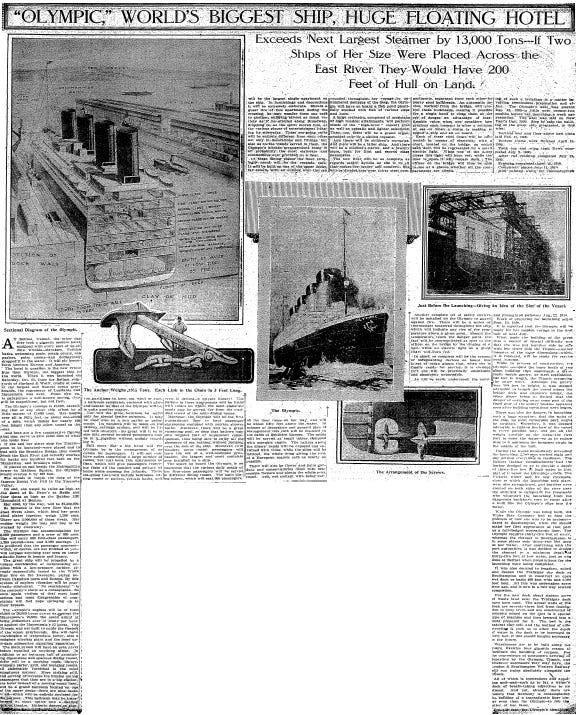 The Olympic and her sister ship the Titanic were similar ocean liners for the White Star Line, starting construction just a few months apart. Of course, the Titanic met famously with disaster just about 18 months after this article was written, but the Olympic continued service until 1935 despite having her own mishaps.