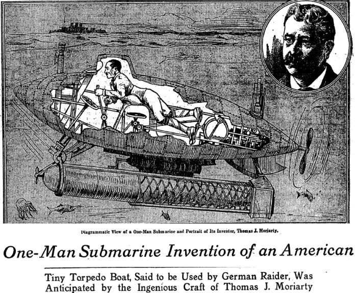 One-Man Submarine Invention of an American: Tiny Torpedo Boat, Said to be Used by German Raider, Was Anticipated by the Ingenious Craft of Thomas J. Moriarty