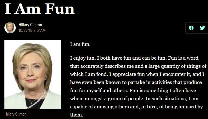 While there's no longer Prohibition, the same "killjoy" mentality could also be said of many of our most prominent politicians in the modern era. On the Democratic side, you have Hillary Clinton, who was parodied to a T with this fake op-ed in The Onion: