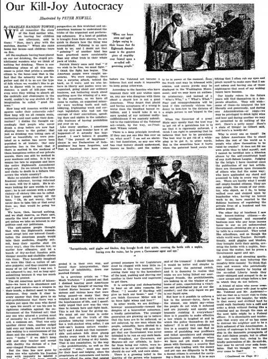 Prohibition's ratification was but one piece of evidence revealing a larger trend: by 1921, wrote columnist Charles Hanson Towne, America was being run by "killjoys."