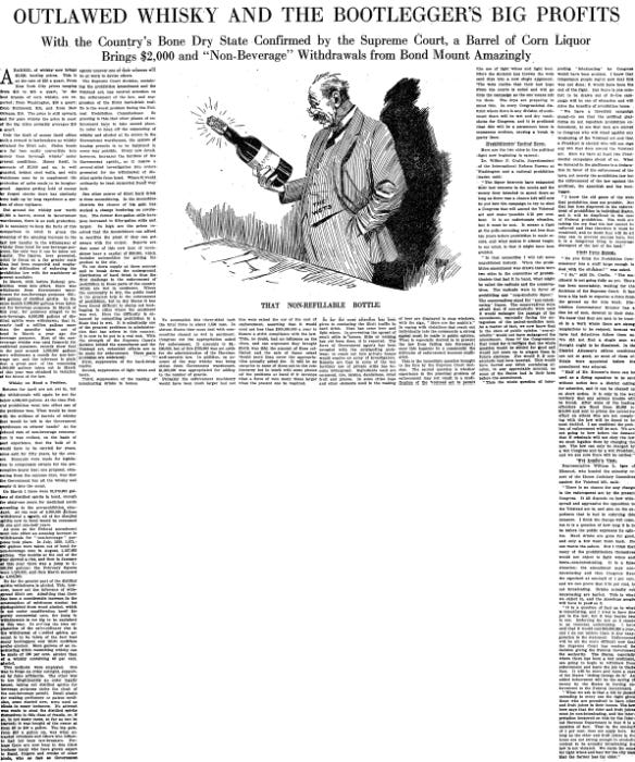On this week a century ago, the Supreme Court upheld Prohibition as constitutional. That same week, a New York Times article reported that a startling amount of alcohol was being withdrawn from government warehouses "for non-beverage purposes." Sure.