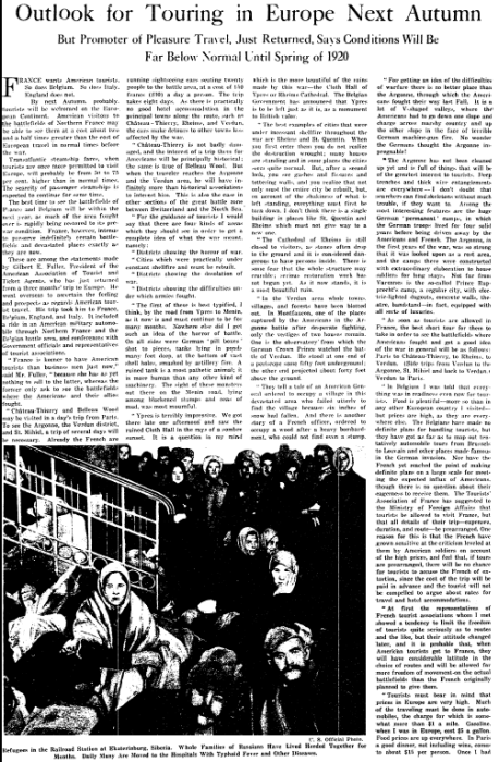 It would probably take until spring 1920 for tourism to Europe to return to normal levels, predicted Gilbert E. Fuller, President of the American Association of Tourist and Ticket Agents. But that varied country by country: