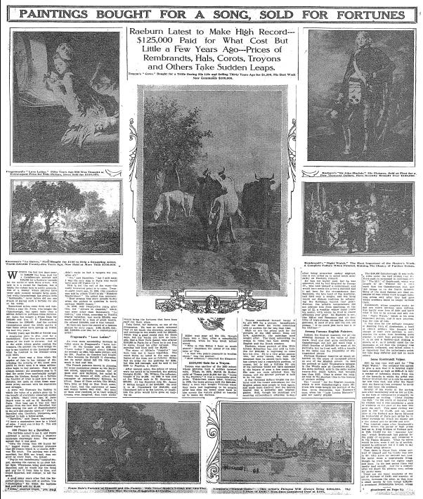 PAINTINGS BOUGHT FOR A SONG, SOLD FOR FORTUNES: Raeburn Latest to Make High Record -- $125,000 Paid for What Cost But Little a Few Years Ago -- Prices of Rembrandts, Hals, Corots, Troyons and Others Take Sudden Leaps. (PDF)