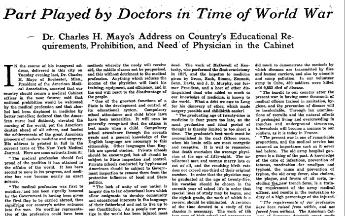 Two years after this was published, Charles Mayo would found the Mayo Clinic, the Minnesota-based nonprofit medical research center that is ranked was the best hospital in the nation last year by U.S. News and World Report. In 1917, though, he was the president of the American Medical Association. He had some thoughts on the role that doctors and the medical profession could play in World War I.