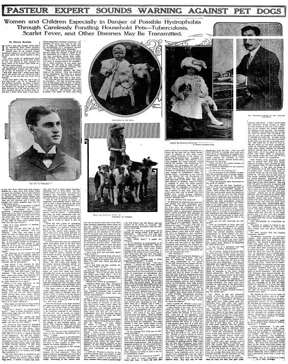 PASTEUR EXPERT SOUNDS WARNING AGAINST PET DOGS: Woman and Children Especially in Danger of Possible Hydrophobia Through Carelessly Fondling Household Pets -- Tuberculosis, Scarlet Feber, and Other Diseases May Be Transmitted. (PDF)