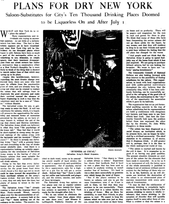 The Salvation Army, for one, is getting ready to enter the field. It will run substitutes for saloons, which, it is hoped, will preserve the opportunities for sociability and innocent forms of recreation presented by the saloon, as we have always known it, without the aid of the cup that cheers and likewise inebriates...