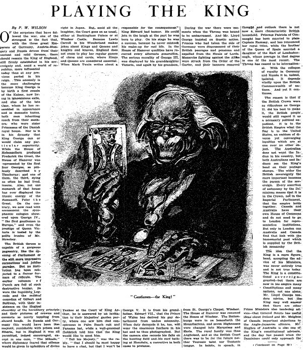 Of the surprises that have followed the war, one of the strangest is the fact that, with the three great Emperors of Germany, Austria-Hungary and Russia driven from their ancient and solid thrones, there should remain the King of England, still firmly established in his sovereignty.