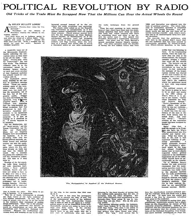 1924's Republican and Democratic Conventions were the first broadcast by radio. That July, Helen Bullitt Lowry wrote in New York Times Magazine that FDR — eight years before winning the presidency — delivered one of only two addresses delivered well for this new medium.