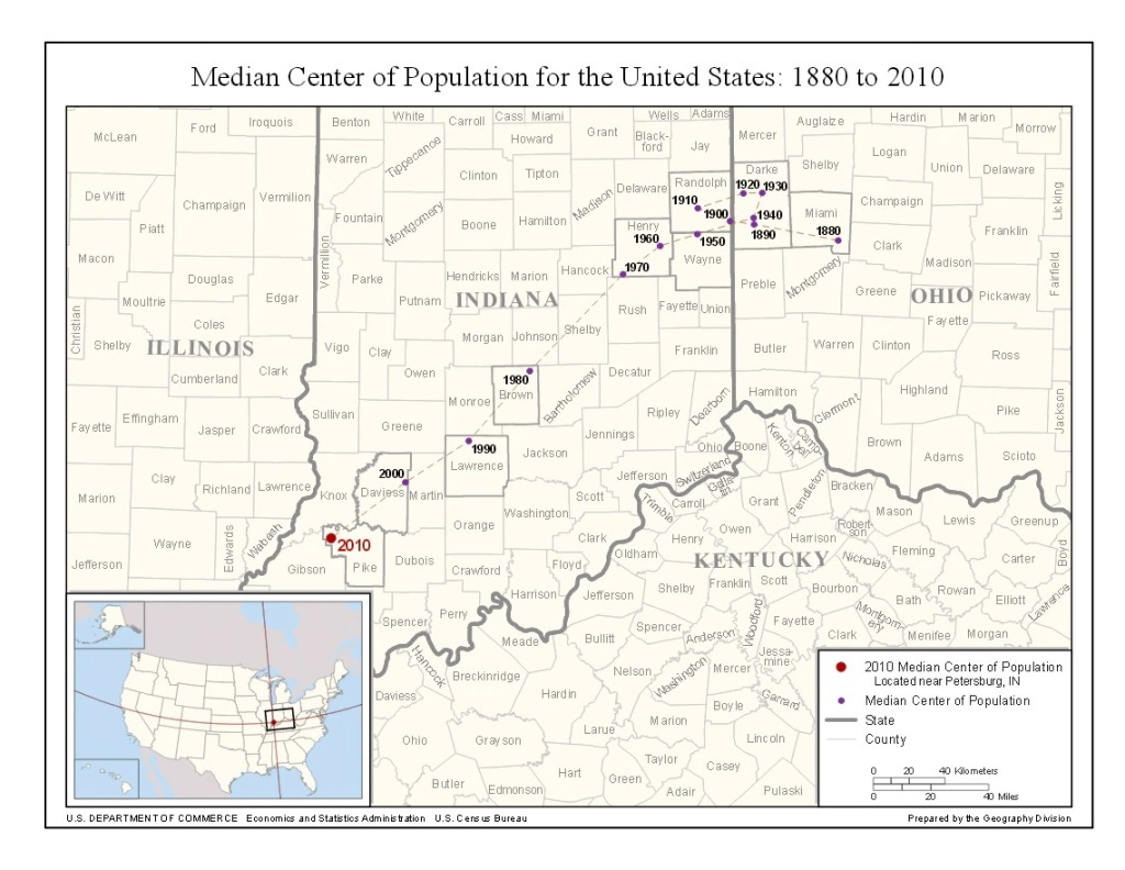 It moved slightly east again in 1930, but has since moved both west and south every decade since. As of 2010, it's located near Petersburg in southwestern Indiana.