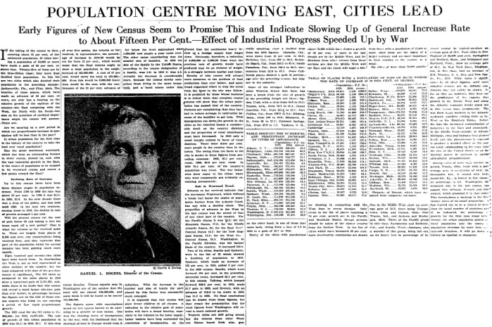 Population Centre Moving East, Cities Lead: Early Figures of New Census Seem to Promise This and Indicate Slowing Up of General Increase Rate to About Fifteen Per Cent. -- Effect of Industrial Progress Speeded Up by War