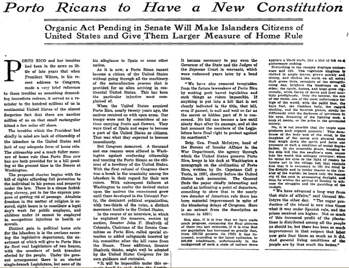 Porto Ricans to Have a New Constitution: Organic Act Pending in Senate Will Make Islanders Citizens of United States and Give Them larger Measure of Home Rule