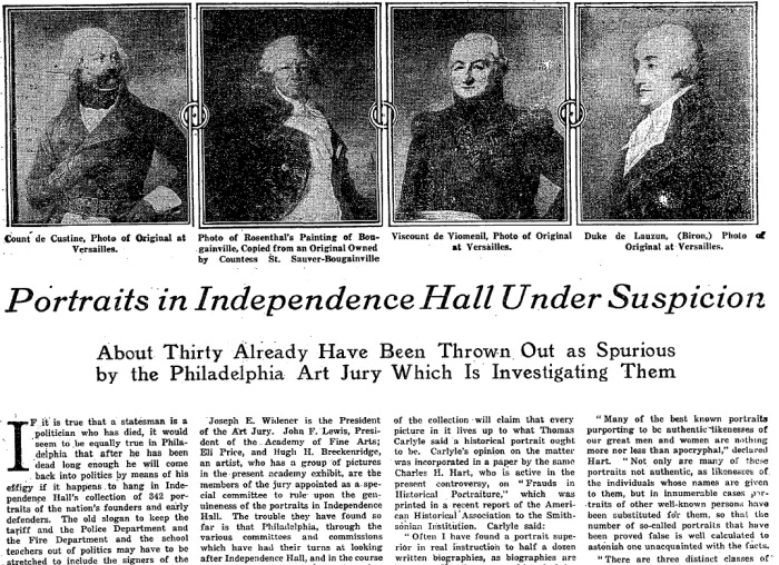 Portraits in Independence Hall Under Suspicion: About Thirty Already Have Been Thrown out as Spurious by the Philadelphia Art Jury Which Is Investigating Them