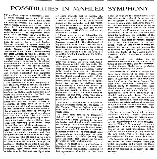 In the time of Mozart a symphonic composer was very well content to have an orchestra of forty men or so -- a few strings, a few wind and percussion instruments. Beethoven rather upset some of the symphonic traditions by writing his ninth symphony, which requires a chorus and four solo voices. Liszt and Berlioz carried the symphonic upsetting of traditions a bit further. Gustav Mahler, however, has seemingly gone several steps further than any of his predecessors.