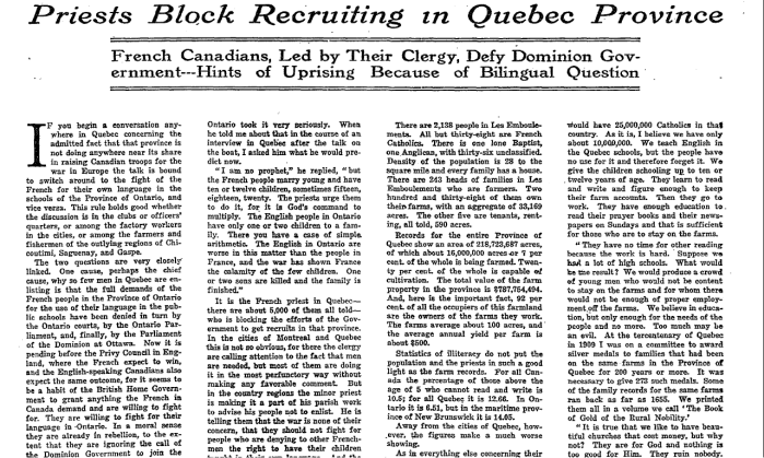 Priests Block Recruiting in Quebec Province: French Canadians, Led by Their Clergy, Defy Dominion Government -- Hints of Uprising Because of Bilingual Question (PDF)
