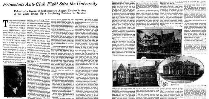 "Election to one of the clubs has come to have altogether too great an importance in the estimation of the students. Club election was not a reason that brought the boy to college, but once he is matriculated election to a club becomes the overshadowing feature of his freshman and sophomore years. It constitutes a great disturbing factor in his college life."