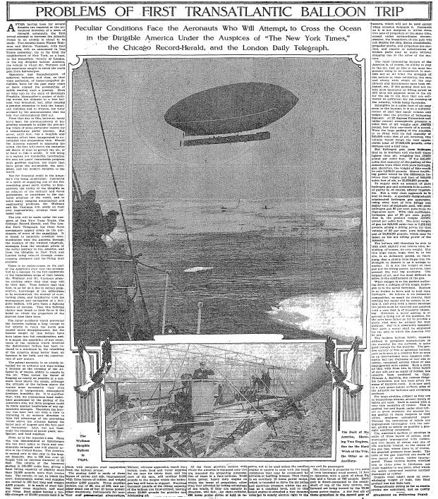 PROBLEMS OF FIRST TRANSATLANTIC BALLOON TRIP: Peculiar Conditions Face the Aeronauts Who Will Attempt to Cross the Ocean in the Dirigible America Under the Auspices of "The New York Times," the Chicago Record-Herald, and the London Daily Telegraph. (PDF)