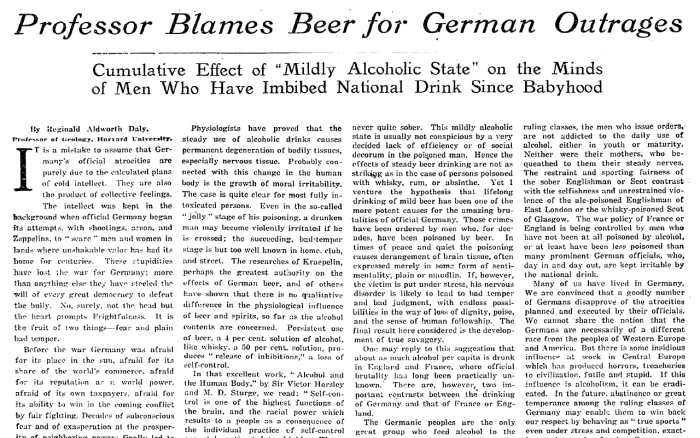 Professor Blames Beer for German Outrages: Cumulative Effect of "Mildly Alcoholic State" on the Minds of Men Who Have Imbibed National Drink Since Babyhood