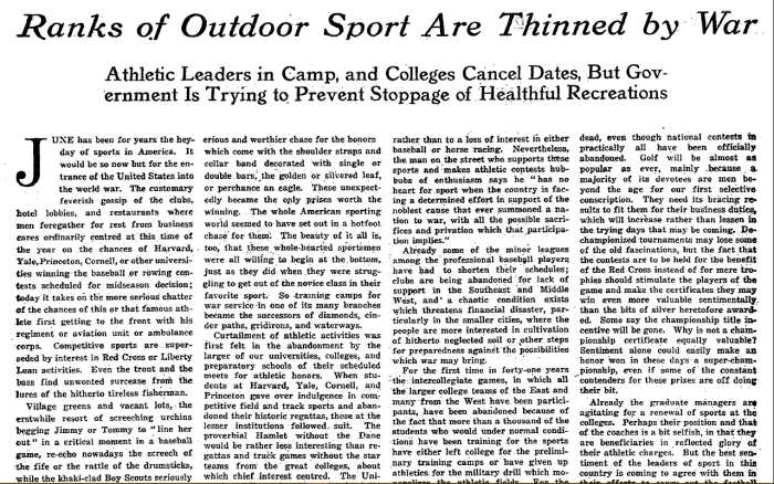 "For the first time in forty-one years the intercollegiate games, in which all the larger college teams of the East and many from the West have been participants, have been abandoned because of the fact that more than a thousand of the students who would under normal conditions have been training for the sports have either left college for the preliminary training camps or have given up athletics for the military drill which monopolizes the athletic fields. For the first time since the close of the war between the States there will be no big college regattas, nor any national rowing regatta. National golf and tennis championships have been declared off, either for good and sufficient sentimental reasons or because of 'unnecessary hysteria' over the sporting situation, as some of the followers of these sports declare."