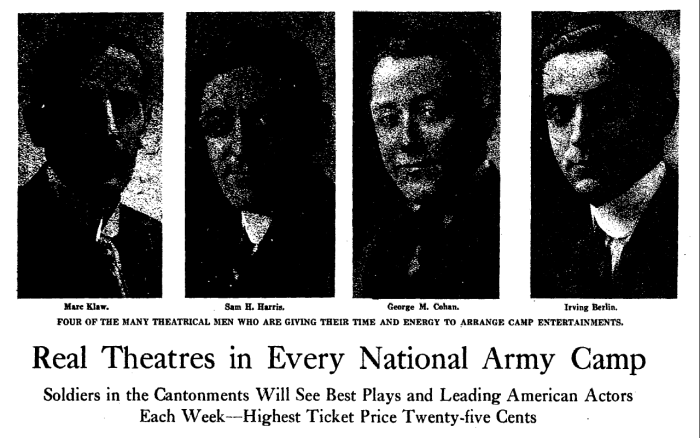 Marc Klaw, a member of the Commission on Training Camp Activities, was tasked with building 16 such theaters for up to 600,000 soldiers to view. "We will have eight companies on the road all the time, four dramatic and four vaudeville," Klaw said. "Plays will be up to date, and only first-class performers will be engaged." Irving Berlin was one of the first performers to sign up.
