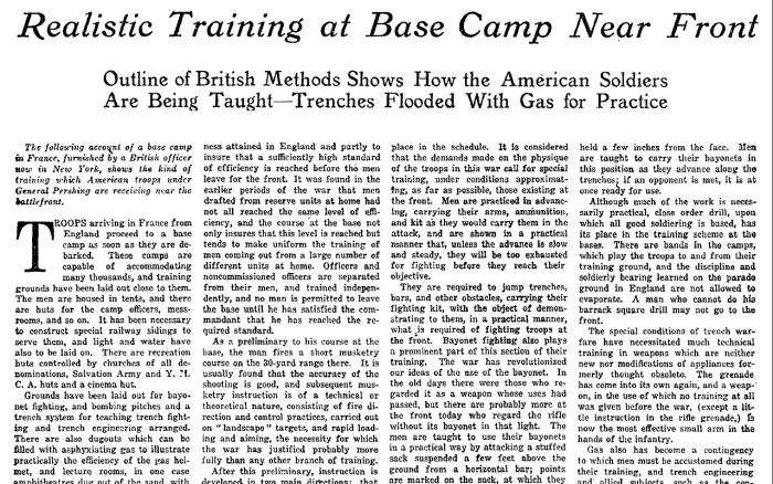 Realistic Training at Base Camp Near Front: Outline of British Methods Shows How the American Soldiers Are Being Taught -- Trenches Flooded With Gas for Practice