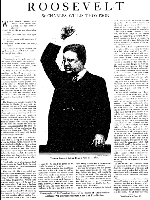 Mean minds, incapable of imagining that a man would do anything except for advantage, cast about for Roosevelt's motive. It must be that he had a motive; by which they meant a selfish one. They hit on it -- it was spectacular drama to impress the crowd, or demagogic ostensible democracy to get votes. It was not possible to suppose that he actually liked these boxers and wolf-killers and reporters and wanted to be with them.