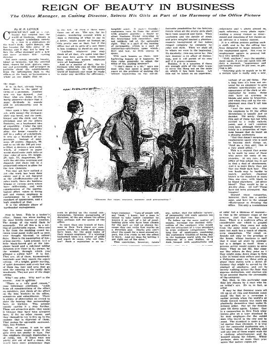 In a June 1924 New York Times Magazine article, M.B. Levick analyzed the rise of women's looks as a preeminent qualification in hiring.