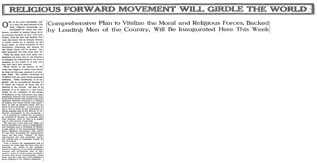RELIGIOUS FORWARD MOVEMENT WILL GIRDLE THE WORLD: Comprehensive Plan to Vitalize the Moral and Religious Forces, Backed by Leading Men of the Country, Will Be Inaugurated Here This Week. (PDF)