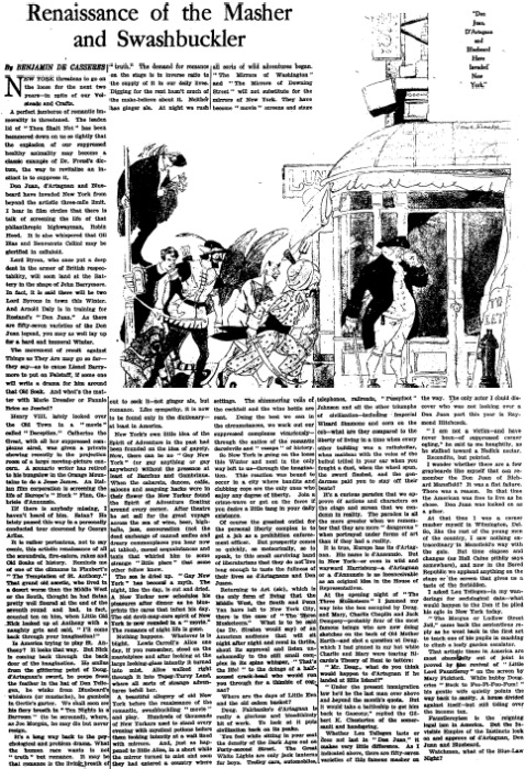 Don Juan, d'Artagnan, and Bluebeard have invaded New York from beyond the artistic three-mile limit. [Those first two are references to the 1921 Broadway productions of Don Juan and The Three Musketeers, though I couldn't ascertain the Bluebeard reference with certainty.] In film circles... there is talk of screening the life of that philanthropic highwayman, Robin Hood. [1922's Robin Hood would star Douglas Fairbanks.]
